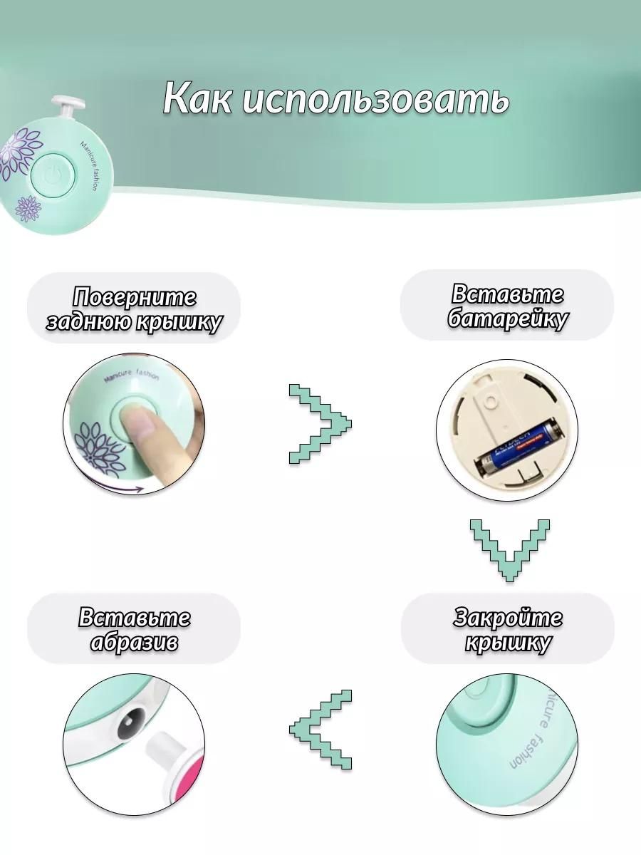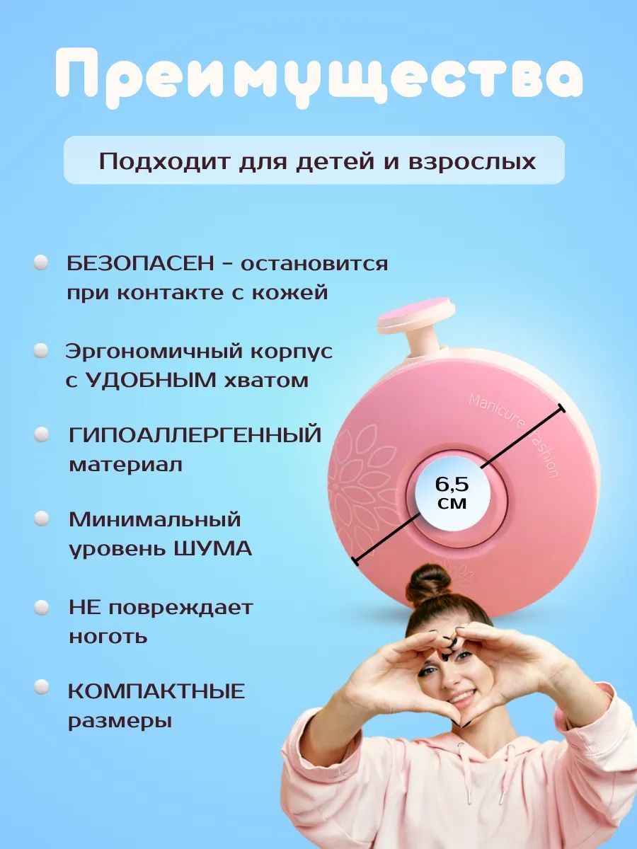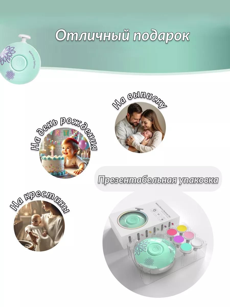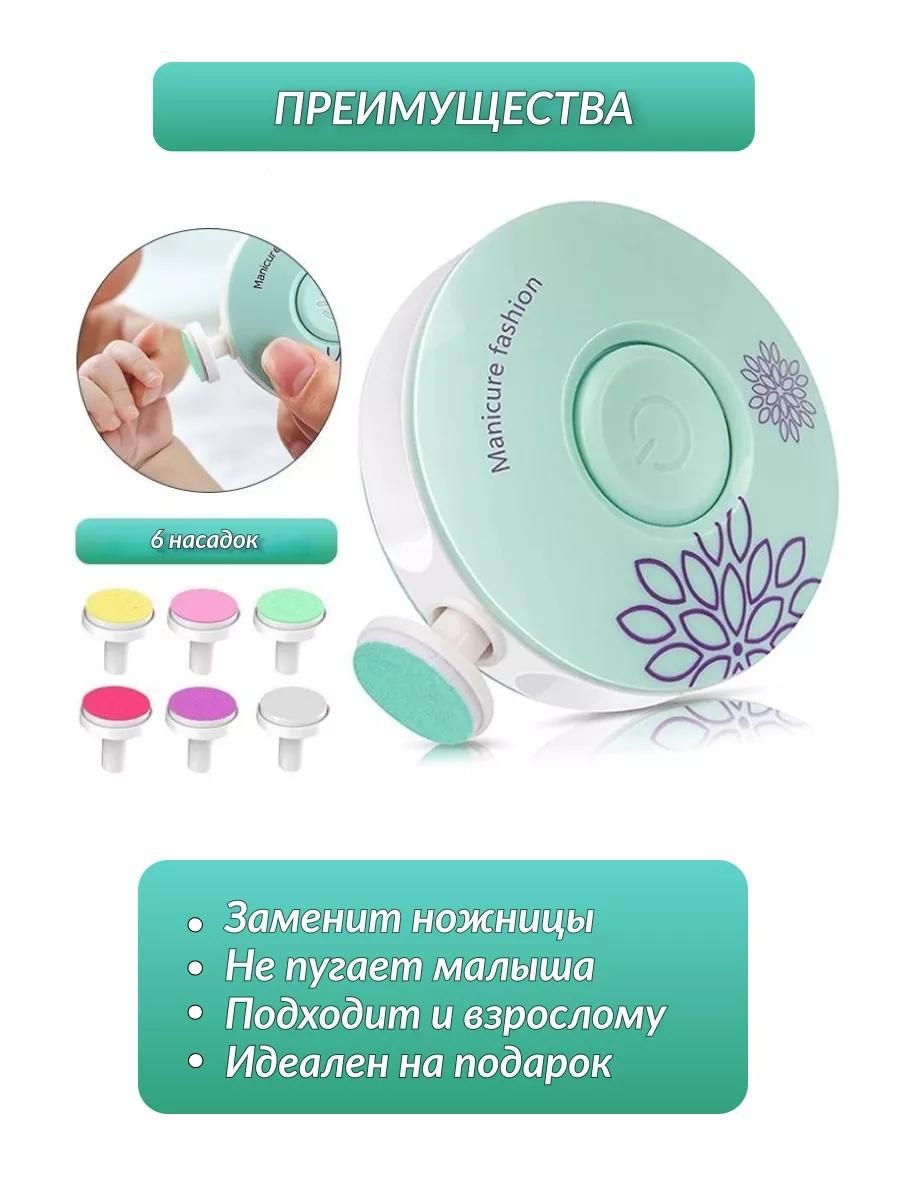 • Яркие насадки — малыш будет спокойно относиться к стрижке ногтей, принимая электропилочку как игру.