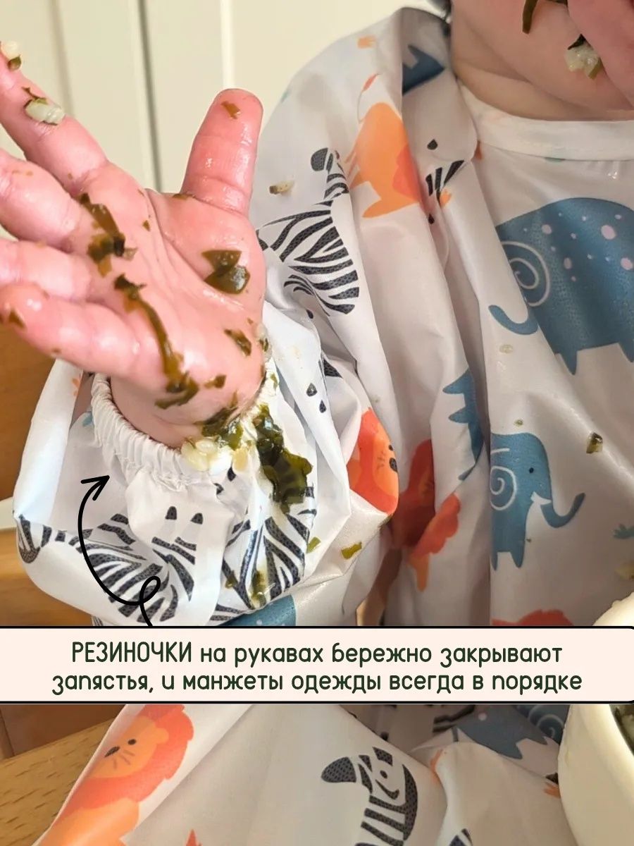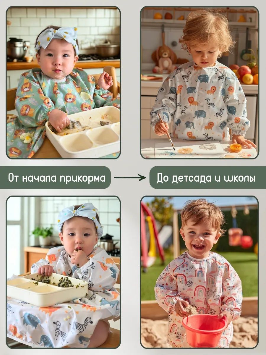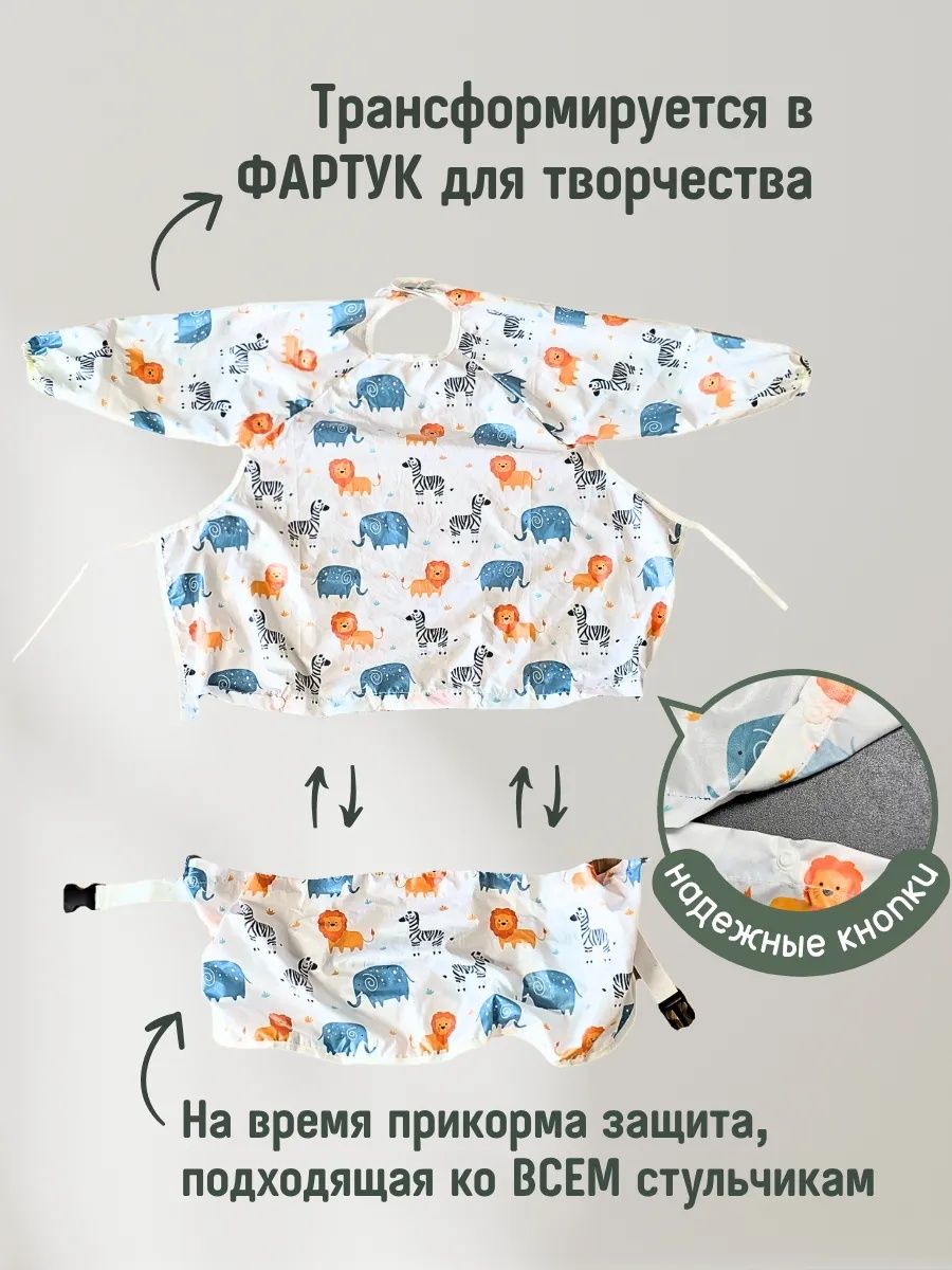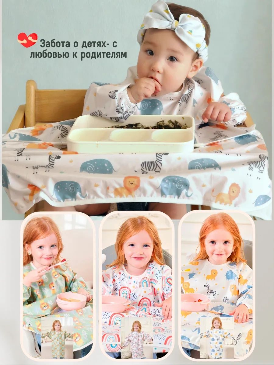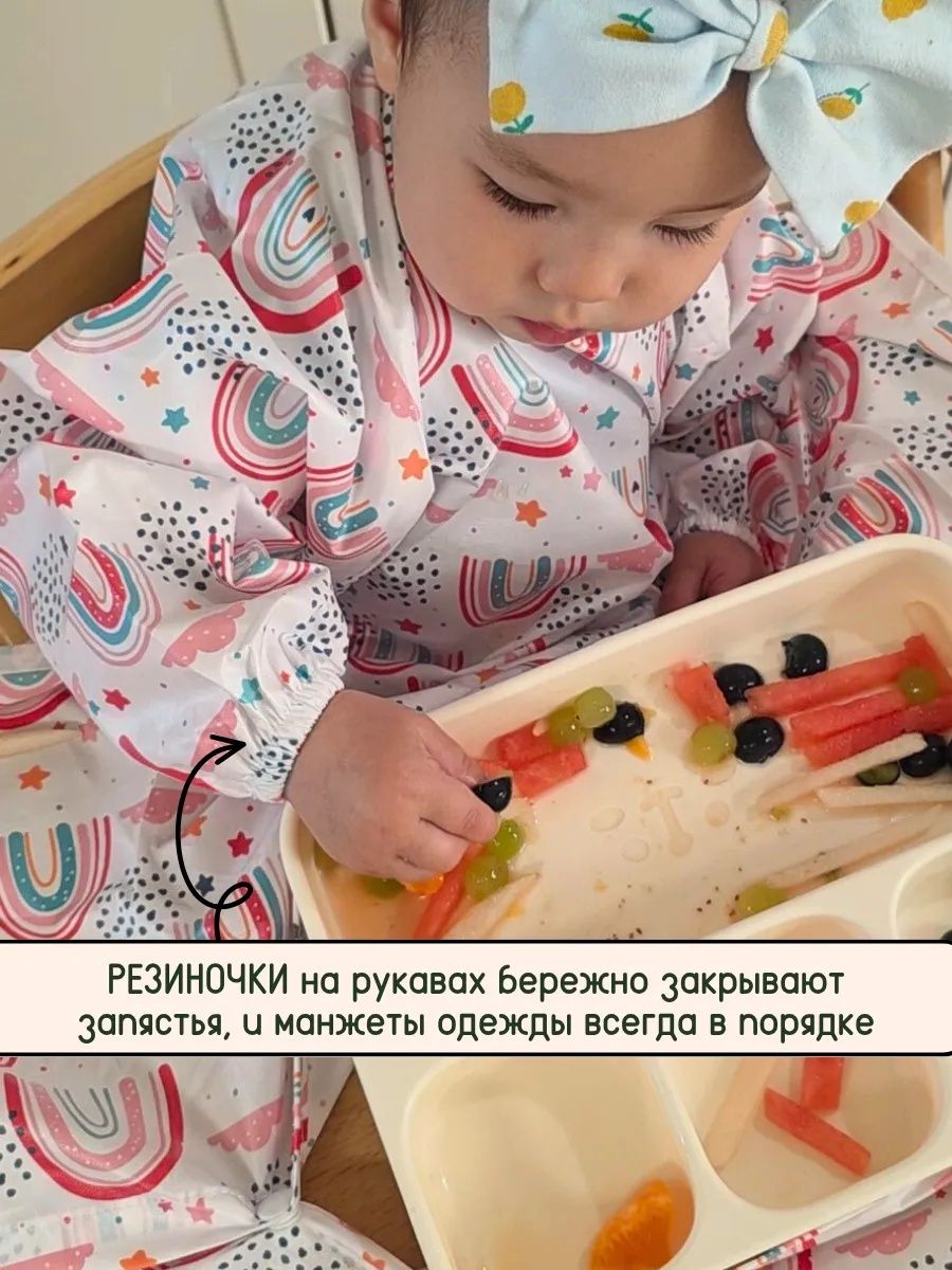 Нагрудник для кормления с рукавами — спасение для мам, уставших после каждого приема пищи полностью мыть малыша и менять одежду. Этот непромокаемый фартук надежно защищает одежду ребенка от пятен, каш, пюре и других загрязнений, позволяя малышу оставаться чистым даже во время активного прикорма. Благодаря удобному крою и длинным рукавам ребенок двигается свободно, а мама экономит время и силы — достаточно просто вытереть руки и рот крохи, и всё! Изготовлен из легкого, безопасного и быстро сохнущего материала, легко моется и подходит для ежедневного использования дома, в садике или на прогулке. Стильный дизайн делает процесс кормления приятным и веселым.