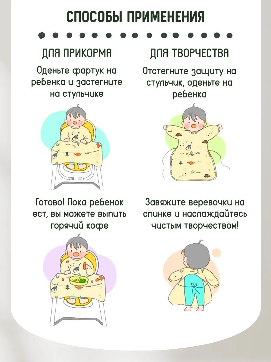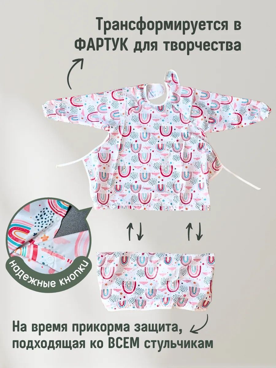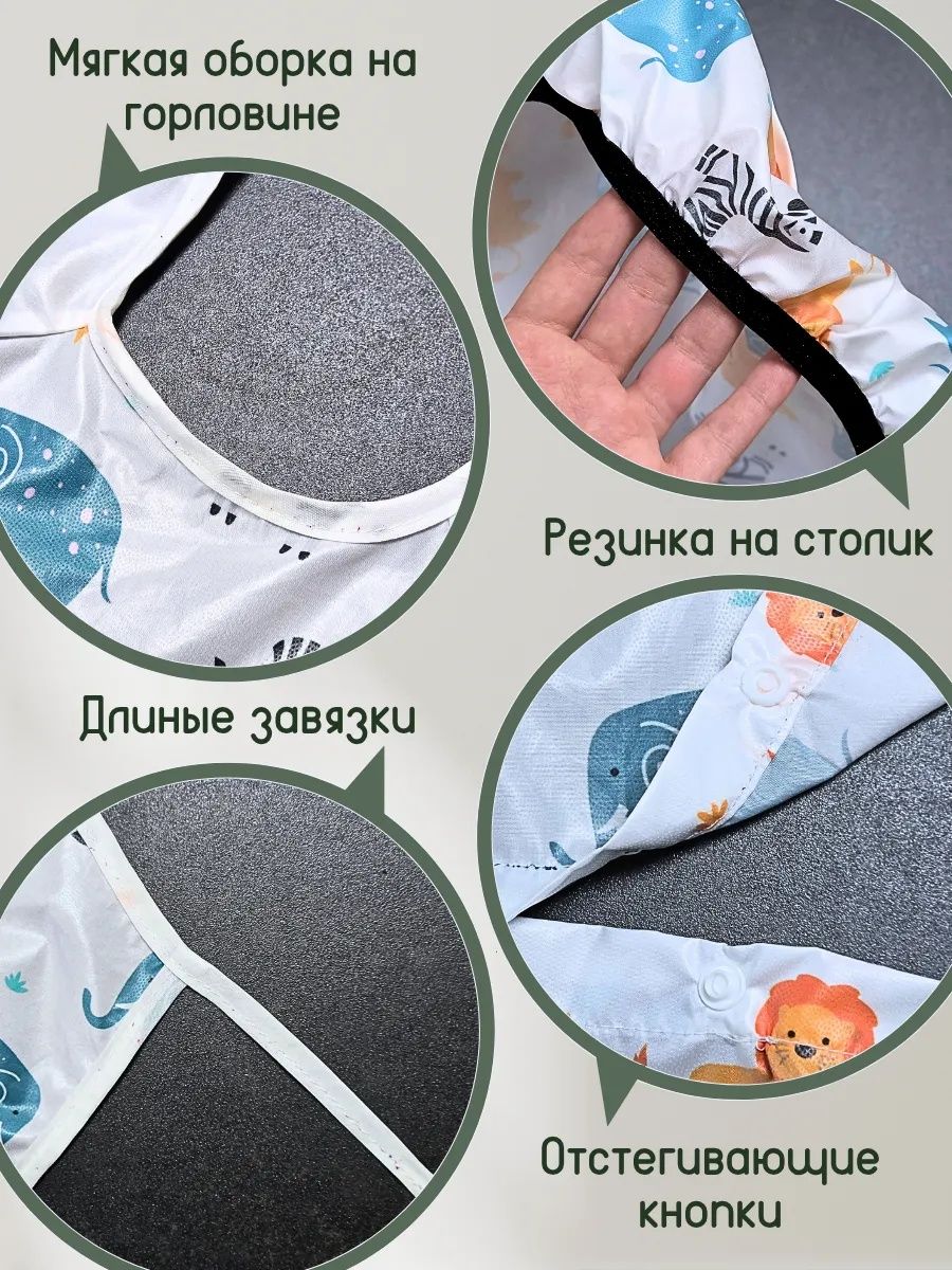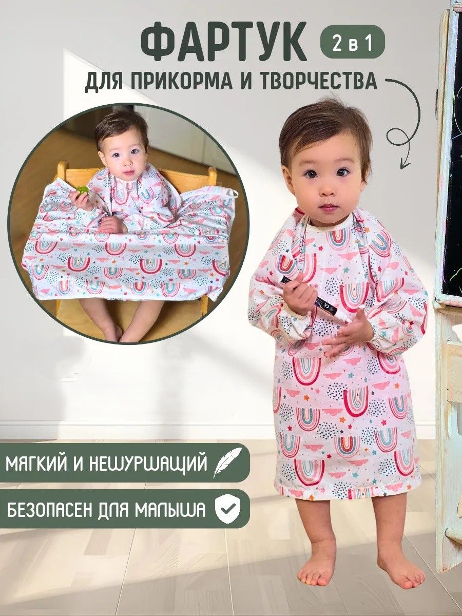 Нагрудник для кормления с рукавами — спасение для мам, уставших после каждого приема пищи полностью мыть малыша и менять одежду. Этот непромокаемый фартук надежно защищает одежду ребенка от пятен, каш, пюре и других загрязнений, позволяя малышу оставаться чистым даже во время активного прикорма. Благодаря удобному крою и длинным рукавам ребенок двигается свободно, а мама экономит время и силы — достаточно просто вытереть руки и рот крохи, и всё! Изготовлен из легкого, безопасного и быстро сохнущего материала, легко моется и подходит для ежедневного использования дома, в садике или на прогулке. Стильный дизайн делает процесс кормления приятным и веселым.
