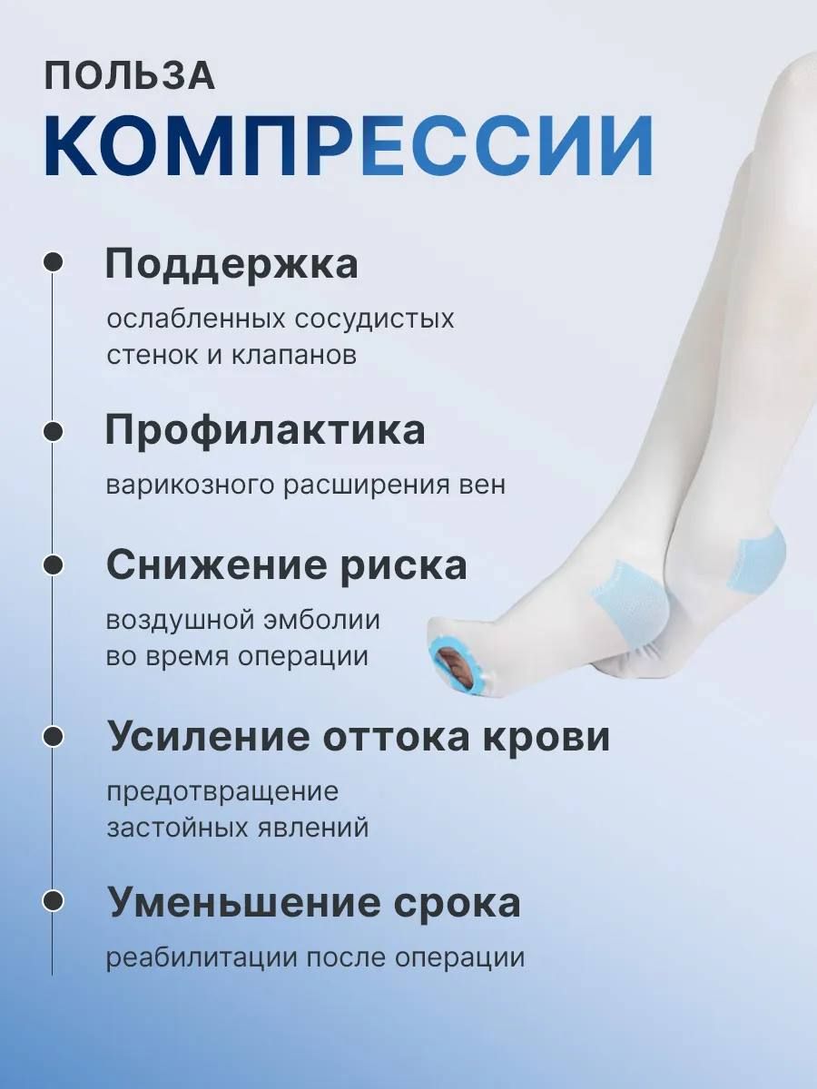 Чулки компрессионные 1 класс компрессии антиэмболические, госпитальные, для операций и родов. Компрессионные чулки антиэмболические Ergoforma 1 класс компрессии предназначены для использования во время хирургических вмешательств и в период реабилитации для профилактики возникновения тромбозов. Чулки антиэмболические Эргоформа 1 класса также назначают во время родов и в раннем послеродовом периоде, для лежачих больных и больных с ограниченной подвижностью. Медицинские компрессионные чулки — это особый вид трикотажных изделий, предназначенный для лечения и профилактики патологий венозного кровообращения. Его основная функция заключается в ускорении движения крови по венам и профилактике застоев. Компрессионные антиэмболические чулки предназначены для использования во время хирургических вмешательств и в период реабилитации для профилактики возникновения тромбозов