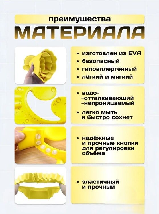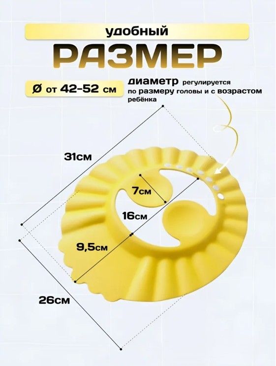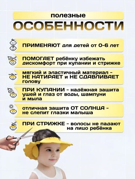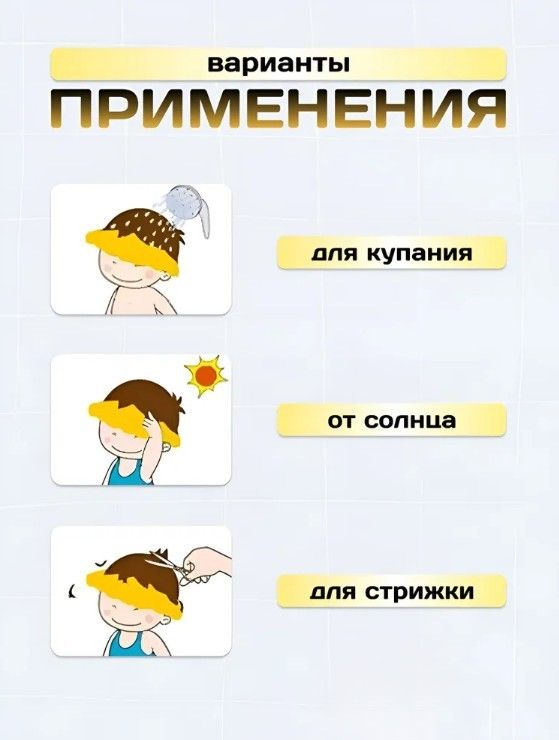 Детский козырёк для купания — удобная и безопасная защита, благодаря которой малыш перестанет бояться мытья головы и не будет плакать от воды и шампуня. Козырёк надёжно закрывает лоб и ушки ребёнка, не позволяя воде и пене попадать в глаза, поэтому купание проходит спокойно и без стресса. Он подходит не только для ванны, но и для стрижки, защищая глаза от остриженных волос, а также может использоваться как лёгкий солнцезащитный козырёк. Застёжки-кнопочки позволяют регулировать размер под голову ребёнка, обеспечивая комфортное прилегание. Изготовленный из мягкого и прочного EVA, он лёгкий, гибкий и не вызывает дискомфорта. Другие модели и расцветки доступны в магазине Mi Mi.