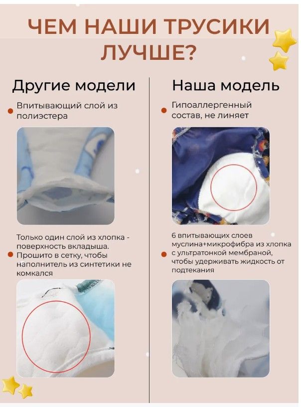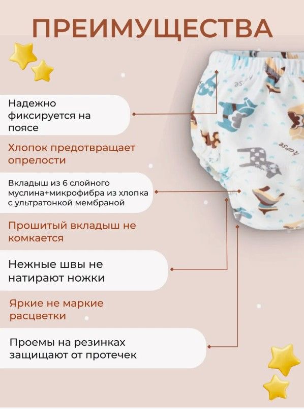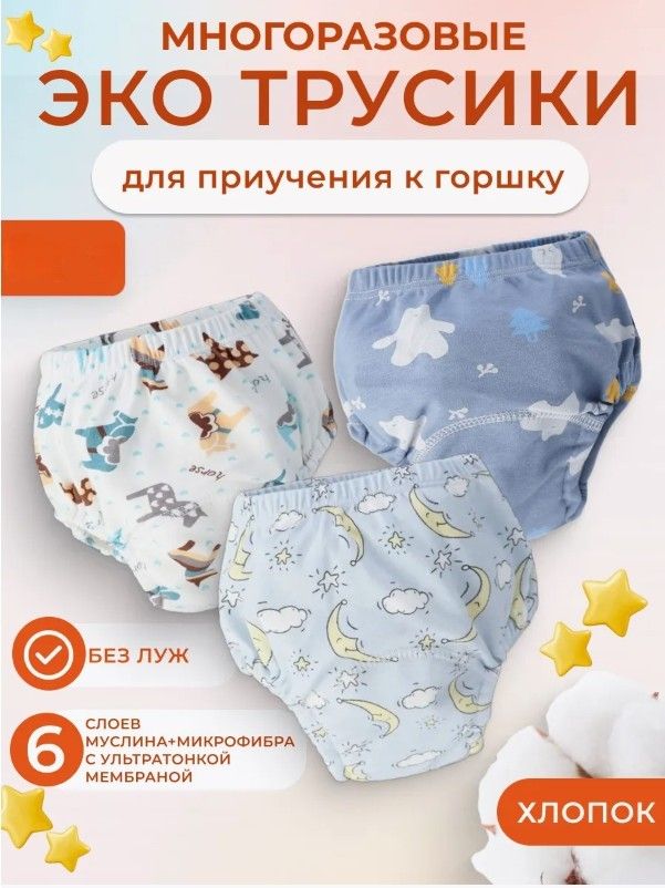 Выбирая многоразовые трусики приучение к горшку Вы заботитесь о природе. Наше изделие для детей состоит из основной хлопковой ткани с рисунком и вшитого вкладыша (основная ткань трусиков из хлопка+микрофибра хлопковая с ультратонкой мембраной+6 слоев муслина). Обеспечивают комфорт и безопасность при ношении. Благодаря своей многоразовой функциональности экономят ресурсы.