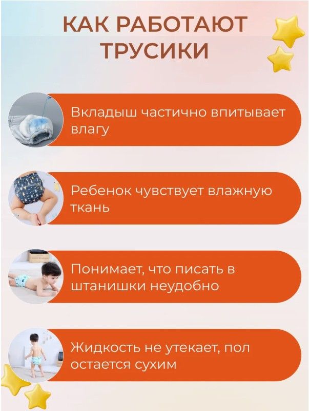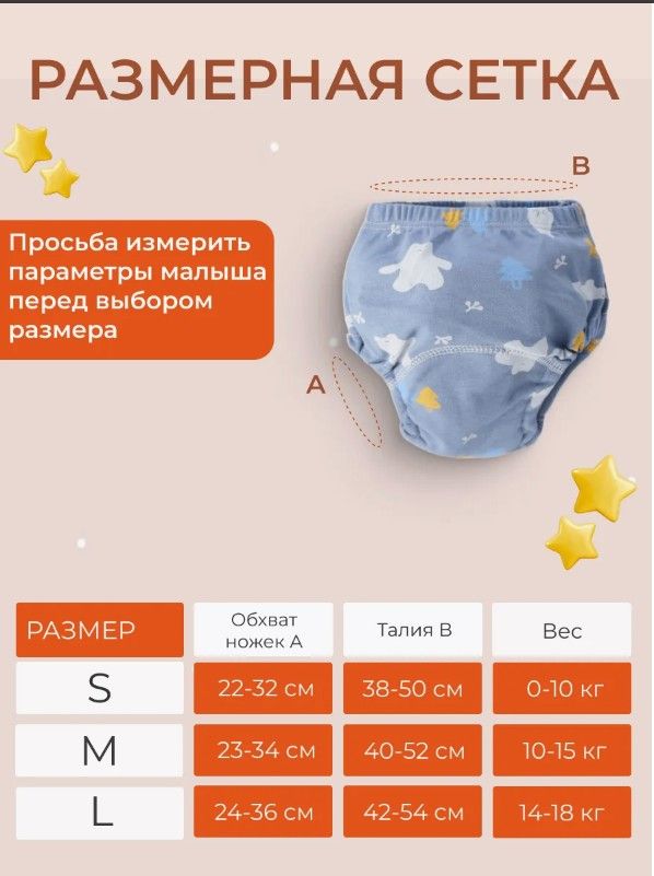 При выборе РАЗМЕРА, просим обратить внимание на размерную сетку в слайде и учитывать обхват ножек и животика малыша. Максимального эффекта трусы для приучения к горшку достигают после