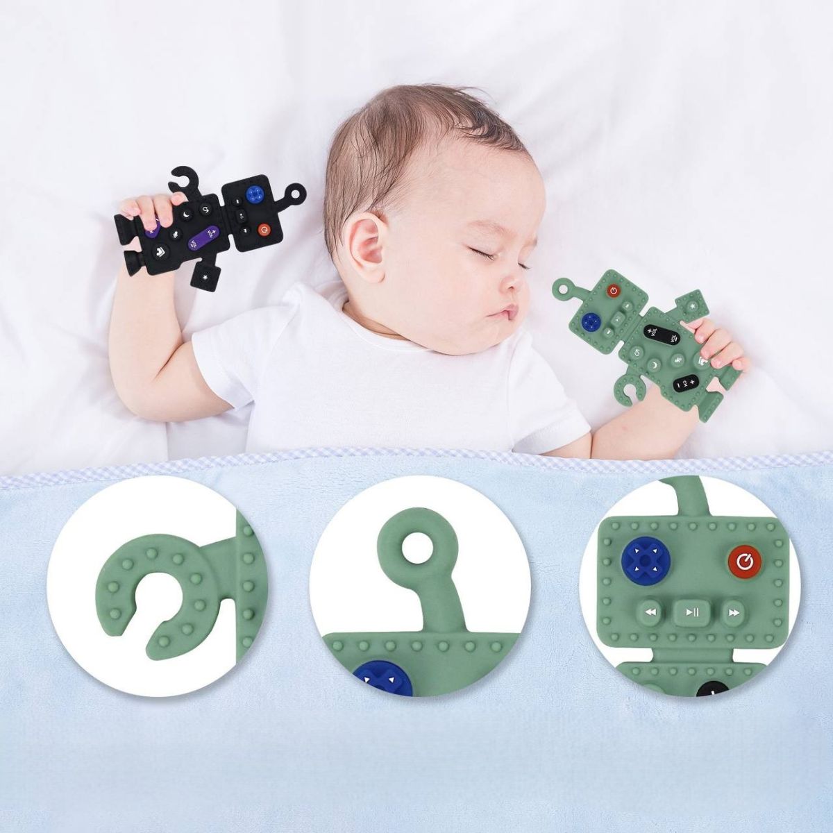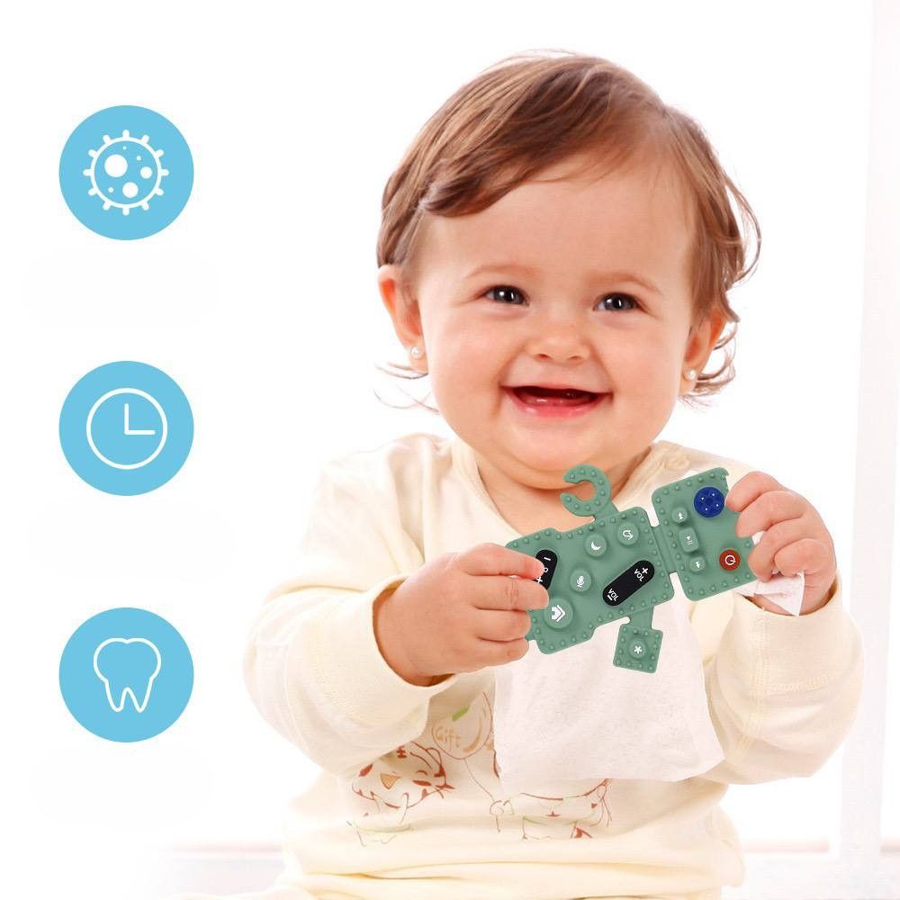 Мультяшный силиконовый робот-прорезыватель с нажимной кнопкой — это универсальная игрушка для малышей, которая эффективно снимает дискомфорт при прорезывании зубов и развивает оральные и моторные навыки. Эргономичная форма удобно размещается во рту ребёнка, мягко массируя дёсны и способствуя формированию правильных навыков жевания и глотания. Изготовлен из безопасного пищевого силикона, легко моется и абсолютно безопасен для младенцев. Безручной дизайн помогает избежать кусания пальцев, превращая игрушку в полезную и гигиеничную альтернативу самоуспокоению.