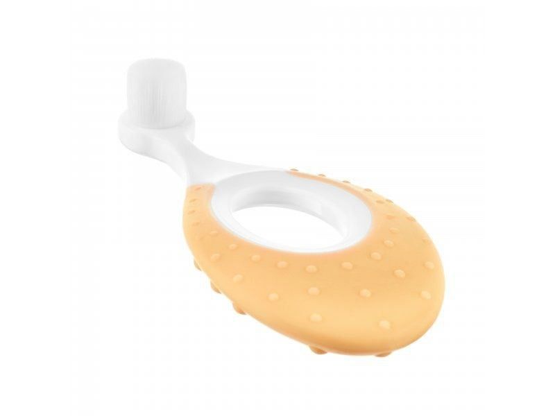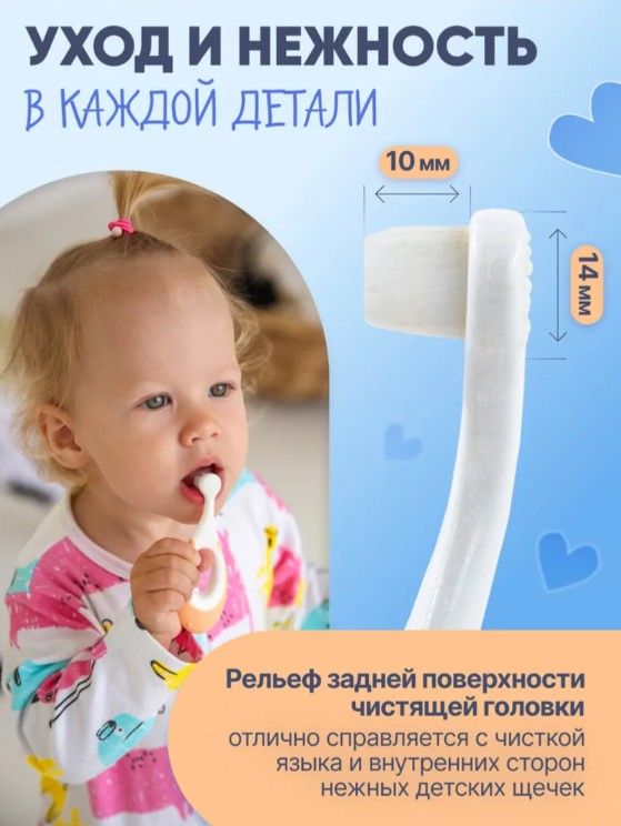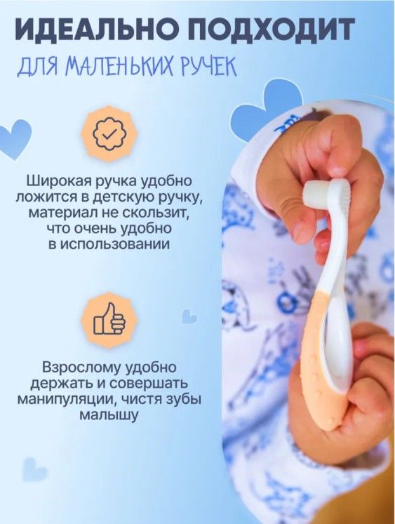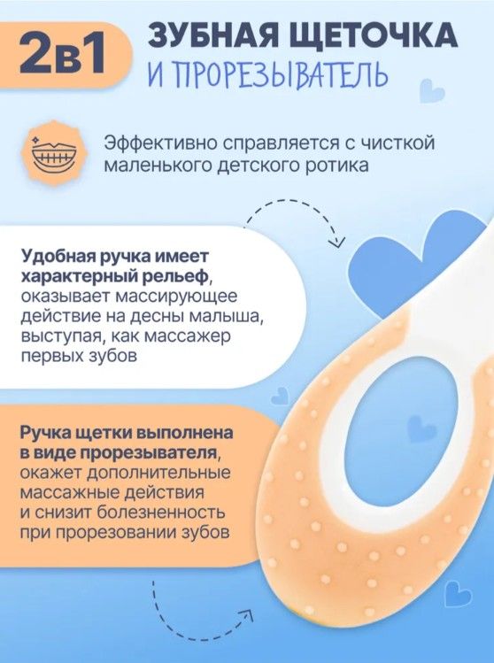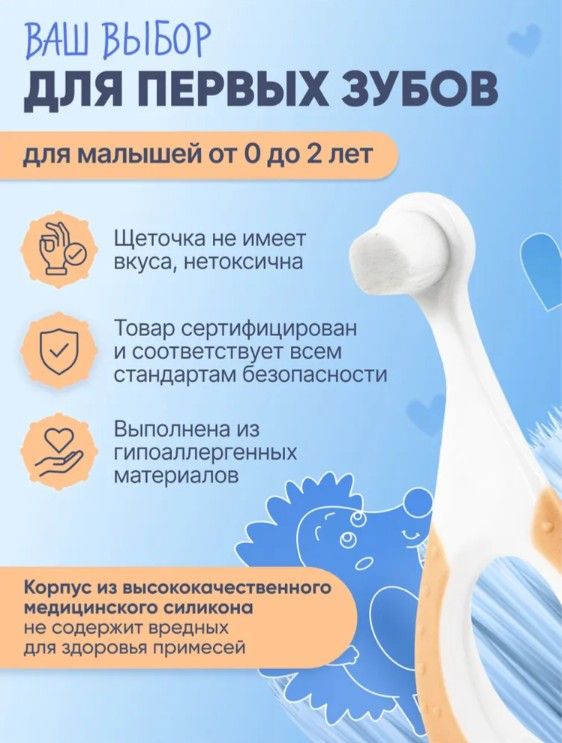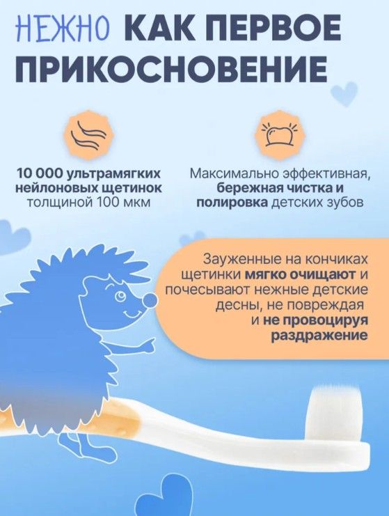 Первая щёточка-грызунок для малыша — идеальное решение для ухода за полостью рта с рождения. Подходит для детей от 0 до 2 лет и полностью заменяет силиконовые напальчники. Оснащена 10 000 ультрамягких нейлоновых щетинок, которые бережно очищают первые зубки, не повреждая дёсны и эмаль. Изготовлена из безопасных и гипоаллергенных материалов. Плотно расположенные щетинки образуют упругий блок, эффективно очищающий зубки, а округлая ручка с массажными точками снижает дискомфорт при прорезывании и выполняет функцию прорезывателя. Рельефная задняя поверхность предназначена для мягкой очистки язычка и внутренних сторон щёк, формируя правильные навыки гигиены с раннего возраста.