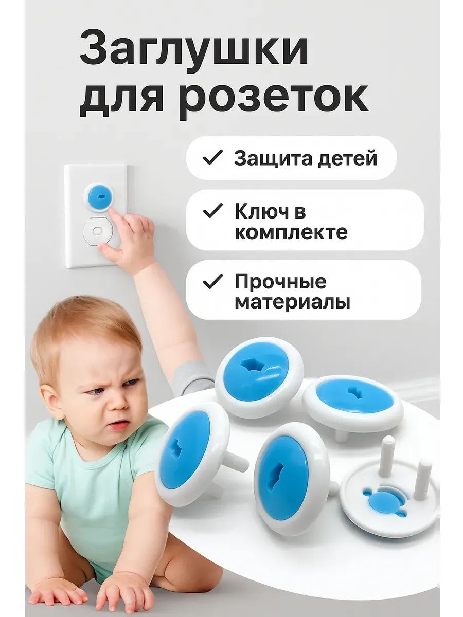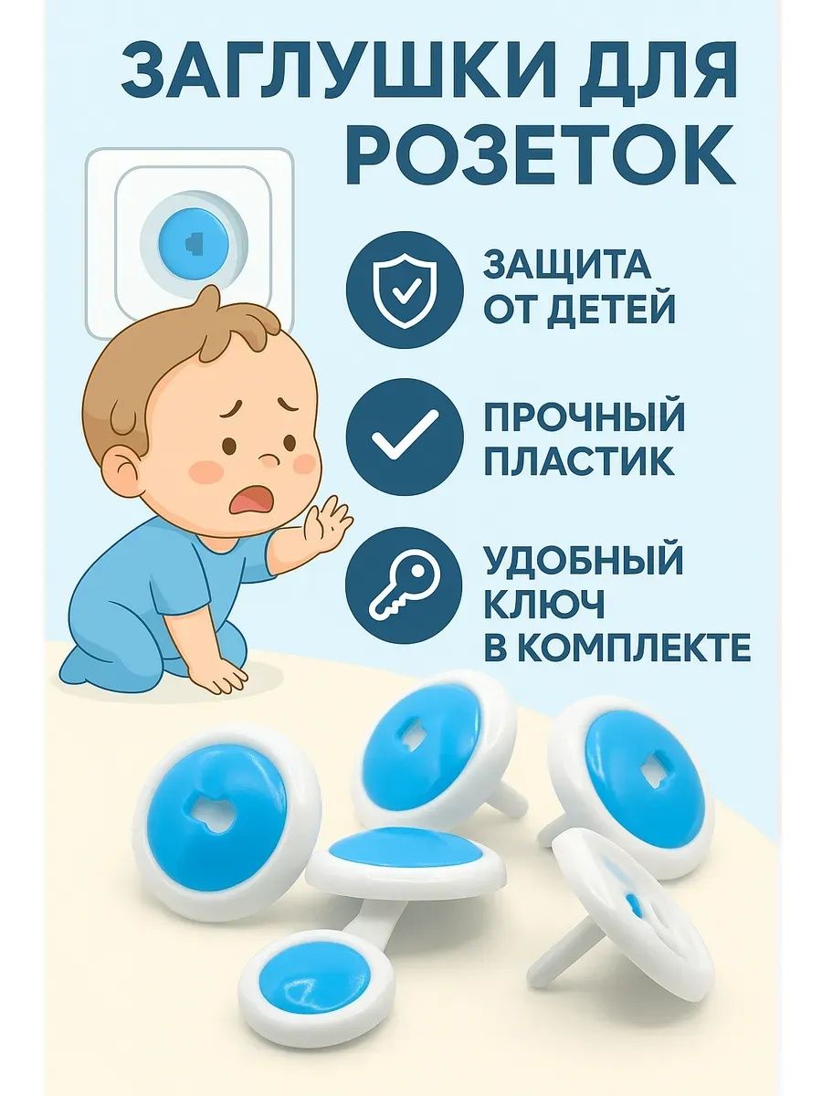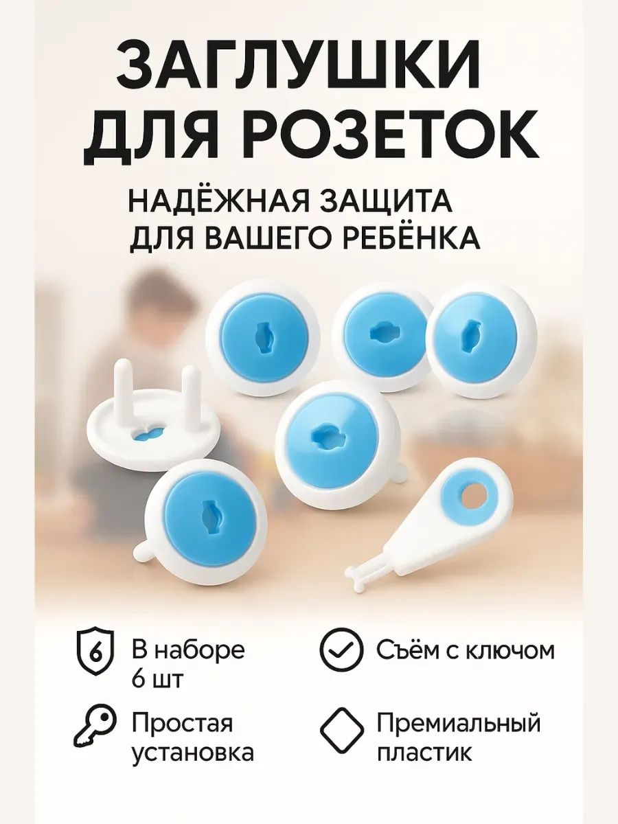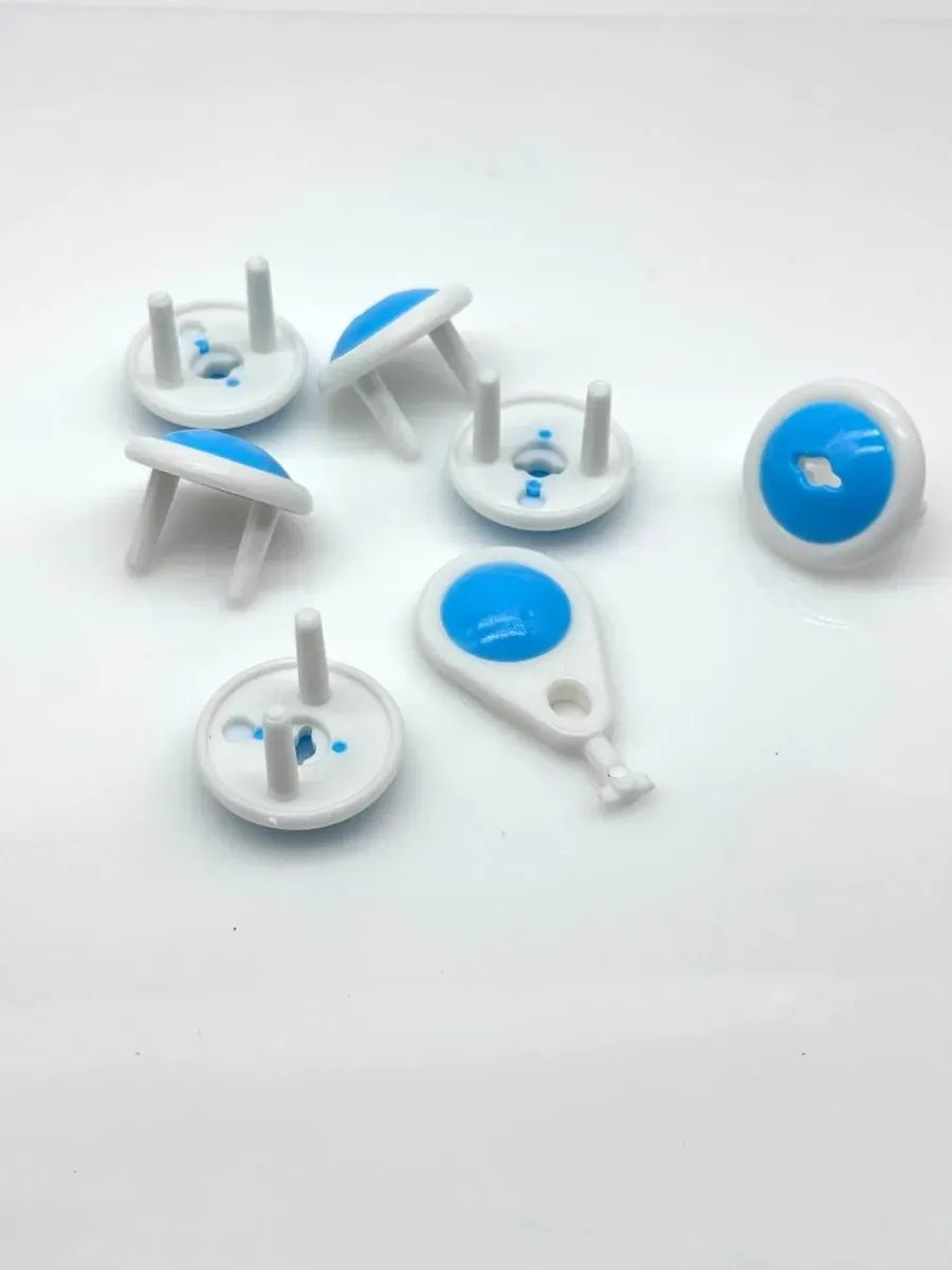 Набор защитных заглушек для розеток с ключом (6 шт.) — надежная защита от удара током, которая полностью блокирует доступ ребенка к электрическим розеткам. Заглушки подходят для большинства стандартных розеток, легко устанавливаются, фиксируются плотно и снимаются только специальным ключом, что делает их максимально безопасными даже для самых любознательных малышей. Прочный пластик без запаха, универсальный бело-голубой дизайн и продуманная конструкция позволяют родителям быть спокойными, пока ребенок играет или исследует дом. Другие расцветки и размеры вы можете посмотреть в нашем магазине Mi Mi.