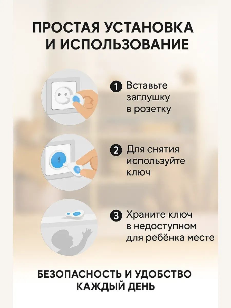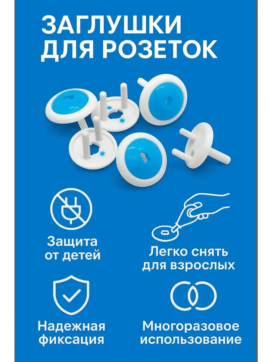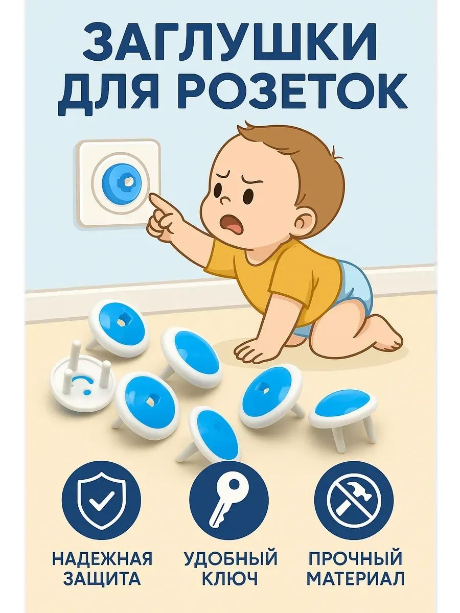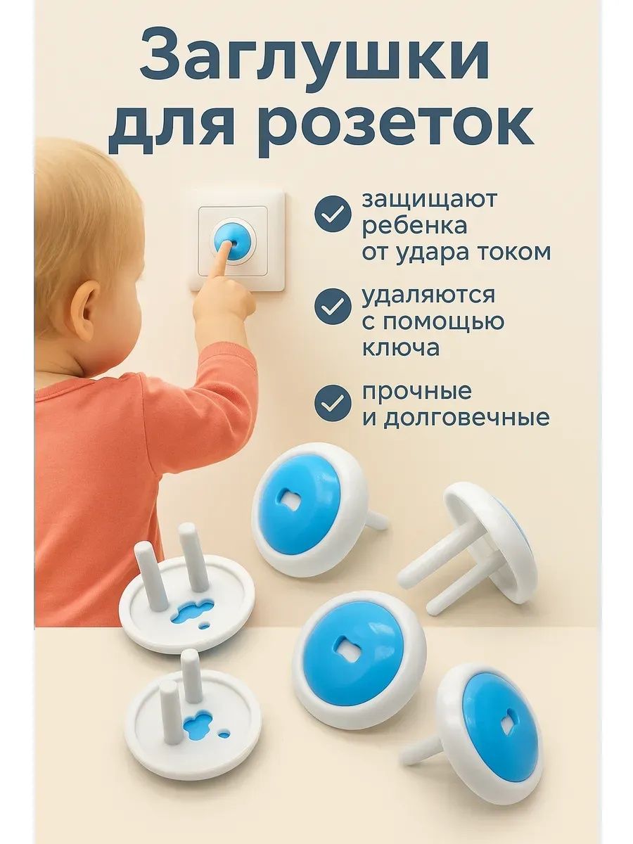 Набор защитных заглушек для розеток с ключом (6 шт.) — надежная защита от удара током, которая полностью блокирует доступ ребенка к электрическим розеткам. Заглушки подходят для большинства стандартных розеток, легко устанавливаются, фиксируются плотно и снимаются только специальным ключом, что делает их максимально безопасными даже для самых любознательных малышей. Прочный пластик без запаха, универсальный бело-голубой дизайн и продуманная конструкция позволяют родителям быть спокойными, пока ребенок играет или исследует дом. Другие расцветки и размеры вы можете посмотреть в нашем магазине Mi Mi.